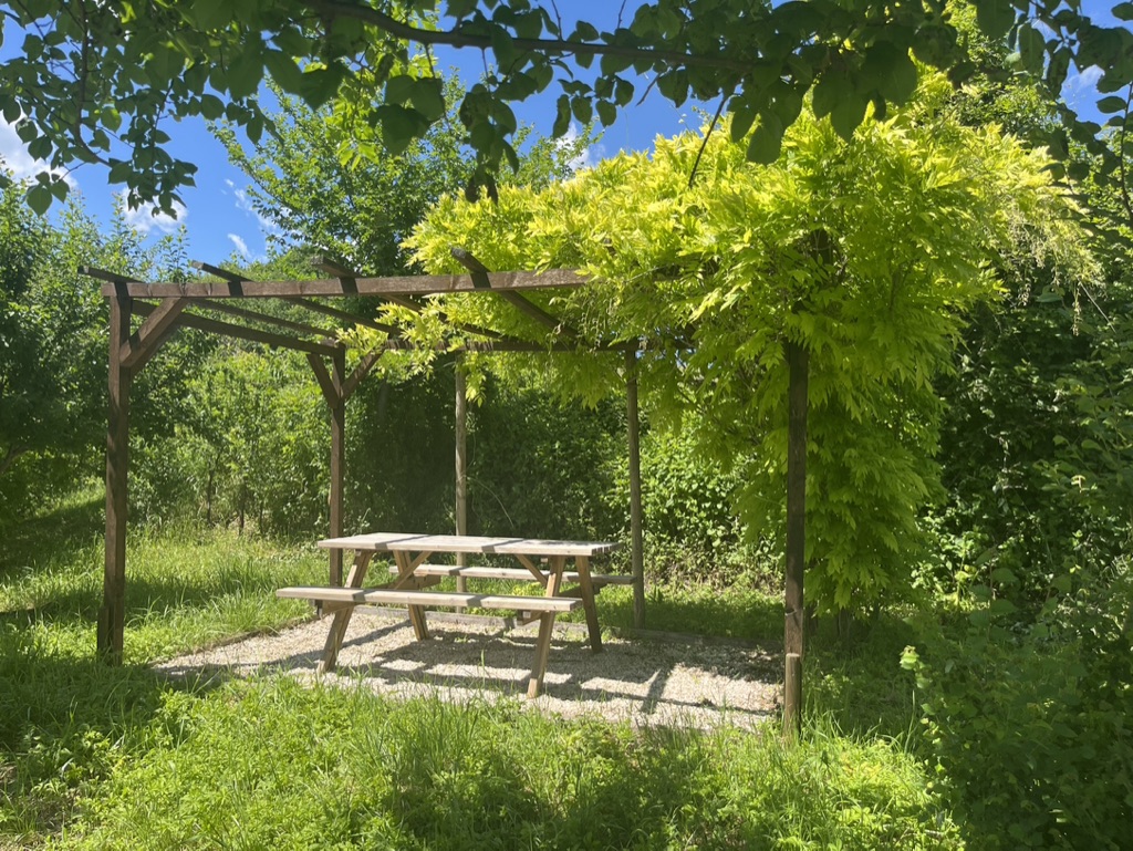 In de tuin (3000m2) staan fruit- en olijfbomen en vanaf de heuvel en of terras kan er genoten worden van het heerlijke uitzicht. Het ruime terras is voorzien van een overdekte portico met dakpannen. Aan de zijkant op het terras staan twee heerlijke lounge banken. Vanaf het terras is er uitzicht op het zwembad en het dorpje Montevecchio of Montafoglio en op de glooiende heuvels waar afwisselend zonnebloemen, granen en andere gewassen worden verbouwd. ‘s Avonds kan de aanwezige barbecue aan en kun je er genieten van een wijntje. Voor de kinderen zijn er leuke speelgelegenheden zoals een trampoline, spelletjes en DvD's aanwezig. Sinds juli 2019 is er een nieuw mooi zwembad gebouwd van 10 bij 5 meter en 1.30meter diep inclusief inlooptrap. Het terras welke toegankelijk is vanaf het huis, voorzien van hek, is voorzien van ligbedden, parasols en lounge stoelen. In het voorjaar van 2019 is er nieuwe beplanting gezet langs de rand van het terras voor extra groene aankleding zoals rozemarijn, lavendel en extra bomen.